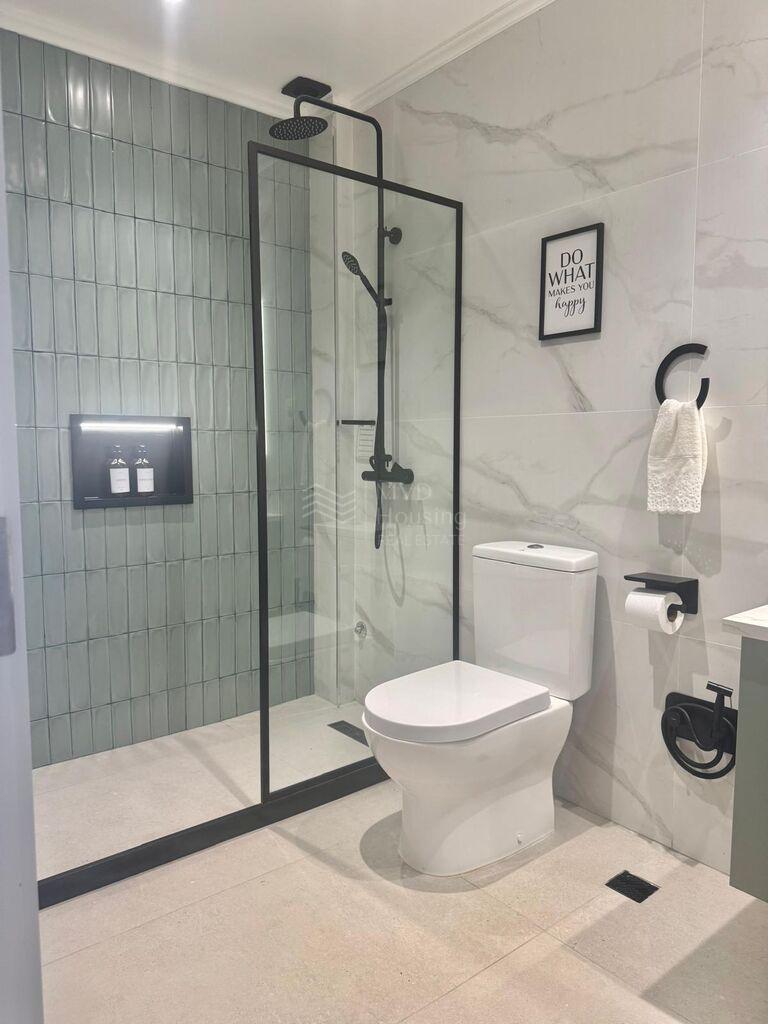 - Baño completo con mampara de cristal, mueble en mdf con bacha y grifería monocomando.